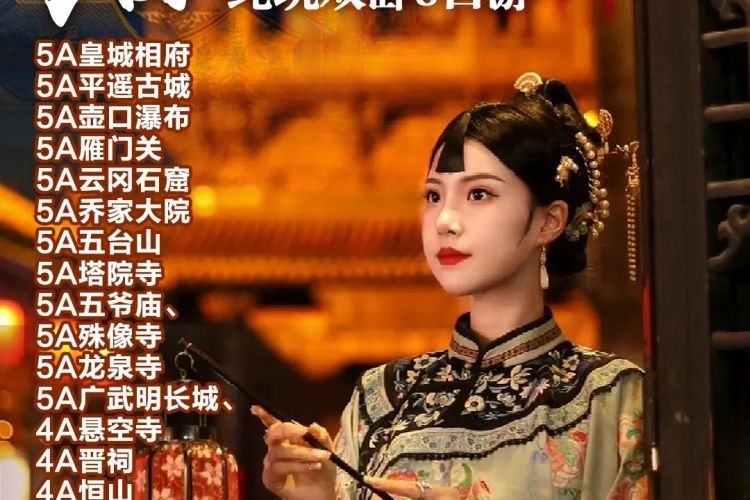 早餐后赴祁县游览被称为“华北第一民俗博物馆”的【乔家大院】(游览时间约1小时),乔家大院位于祁县乔家堡村正中。这是一座雄伟壮观的建筑群体,从高空俯视院落布局,很似一个象征大吉大利的双"喜"字。被专家学者恰如其分地赞美为"北方民居建筑的一颗明珠。后乘车前往5A景区、中华第一关—【雁门关】(小交通已含10元/人,游览时间约1.5小时)是世界文化遗产万里长城的重要组成部分,是长城上的重要关隘,以"险"著称,被誉为"中华第一关",有"天下九塞,雁门为首"之说。 在3000多年的历史岁月中,作为古代中国北境著名边关要塞,雁门关见证和影响了中国的历史进程;亲历了民族融合的艰辛历程,积淀了多民族文化精华;作为中国历史上著名的商道,雁门关见证了古代边贸的兴衰,成就了晋商的辉煌。 雁门关景区是以雁门关军事防御体系历史遗存、遗址为主要景观资源的边塞文化、长城文化、关隘文化旅游区,同时也是杨家将故事的发源地。【广武明长城】(游览时间约0.5小时,古城维护费已含30元/人)是古代长城的防御体系,距今历史悠久,保存最完整的古城之一。 夜游【大同古城墙】(自行参观)。位于大同市中心区域。是我国现存较为完整的一座古代城垣建筑。大同城筑邑历史悠久,早在作为北魏拓跋氏的都城的时候,就已经修筑有规模宏大的城池 | ||||||||||||||||||