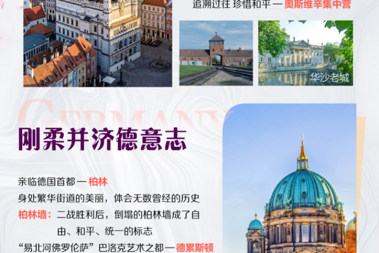柏林城市观光(以下外观景点约2小时):是德国的首都和最大城市,也是欧洲最具活力的城市之一,拥有丰富的历史、文化和现代艺术景观,从冷战分裂到重新统一,柏林承载着复杂的历史记忆。