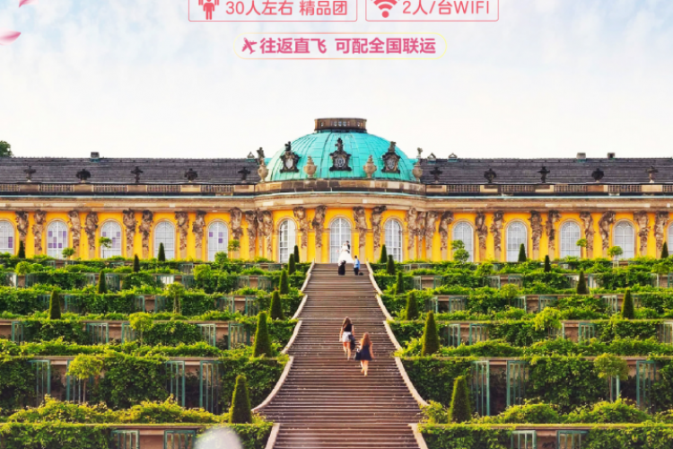 【无忧宫】*(游览时间:不少于1小时):无忧宫是波茨坦的网红景点之一,法语名字"Sanssouci"和这座宫殿贴近自然的设计无不蕴含了腓特烈大帝对于田园式生活的向往。这是他生前最爱的宫殿,1990年,无忧宫被联合国教科文组织列入世界文化遗产名录。(如遇景点关闭,则改为无忧宫花园游览并退门票12欧/人)