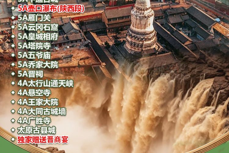 精华景点全含:5A五台山、5A平遥古城、5A壶口瀑布、5A雁门关、5A云冈石窟、5A皇城相府、5A乔家大院、5A太行山、5A塔院寺、5A五爷庙、5A晋祠、4A太行山通天峡、4A悬空寺、4A王家大院、4A大同古城墙、4A宝源醋坊