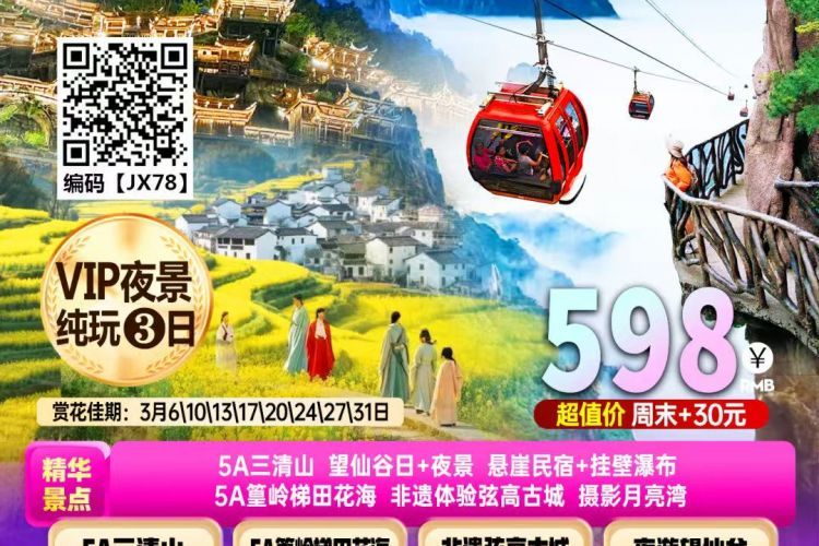 特别提醒:婺源油菜花一般为3月初-4月上旬,具体的花期及观赏效果受气候等自然因素影响较大,若您的出游日期因气候原因未能达到您期望的观赏效果,我公司不承担责任,敬请谅解!